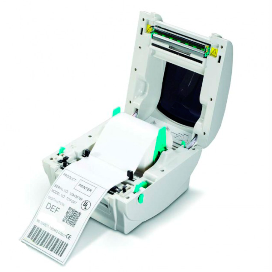 В принтере TSC TTP247 существует возможность установки красящей ленты, длиной до 300 метров. Можно печатать и термотрансферным методом, и методом прямой печати.